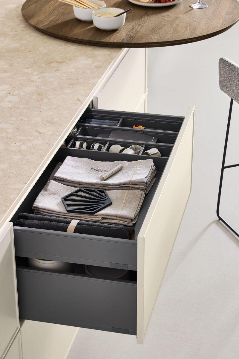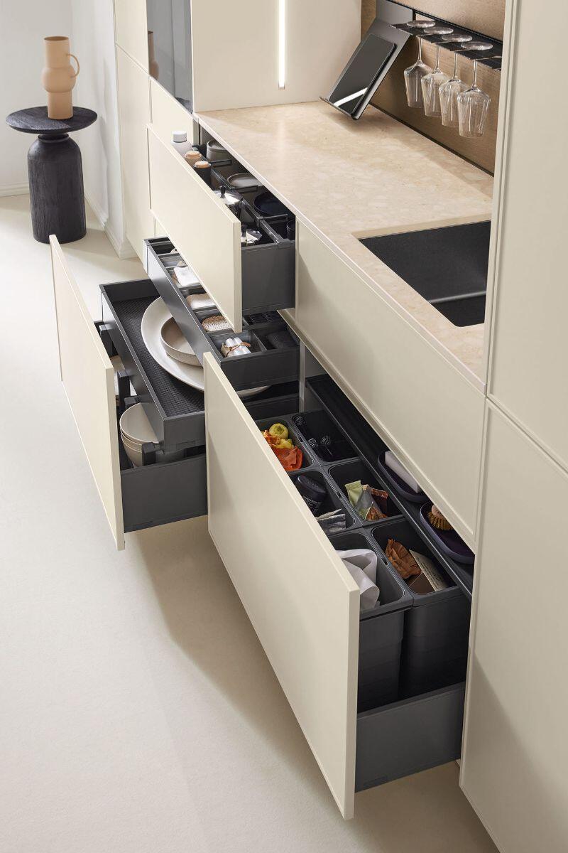 Με καθαρές γραμμές, φυσική δρυ και μαύρες λεπτομέρειες, η σύνθεση ισορροπεί ανάμεσα στον σύγχρονο ρομαντισμό και την εργονομία. Ο στρογγυλός πάγκος από μασίφ ξύλο και οι αποχρώσεις «Live Simple» προσθέτουν ζεστασιά, ενώ οι λειτουργίες pass-through και swing doors εκφράζουν τη γερμανική φιλοσοφία στην πρακτικότητα και τον σχεδιασμό.