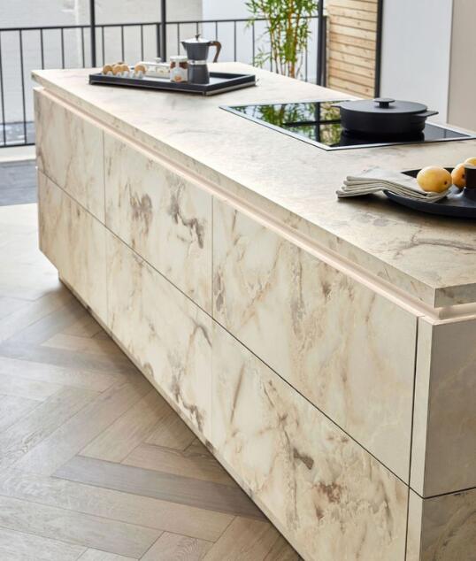 Μοντέρνα έπιπλα κουζίνας με αντοχή και διαχρονικό χαρακτήρα, εμπνευσμένα από την αρχιτεκτονική δύναμη του μαρμάρου και επαναπροσδιορισμένα μέσα από επιφάνειες σύγχρονων τεχνολογιών.
