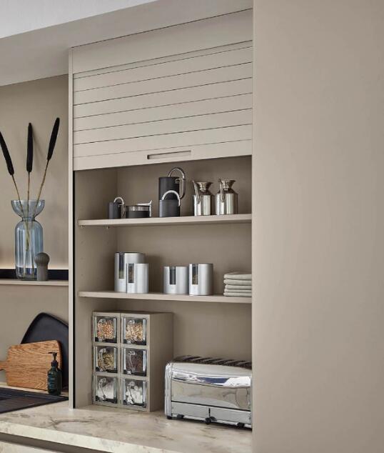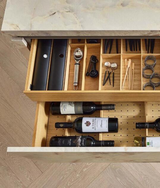 Τα συρόμενα συστήματα και τα εσωτερικά συρτάρια εξοπλίζονται με εξατομικευμένα οργανωτικά στοιχεία από φυσική δρυ, εξασφαλίζοντας τάξη, ευελιξία και άριστη οργάνωση στην καθημερινή χρήση.