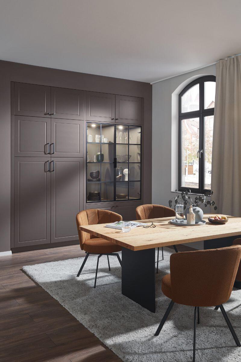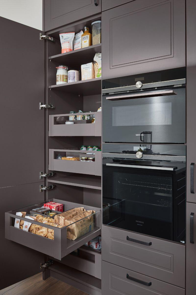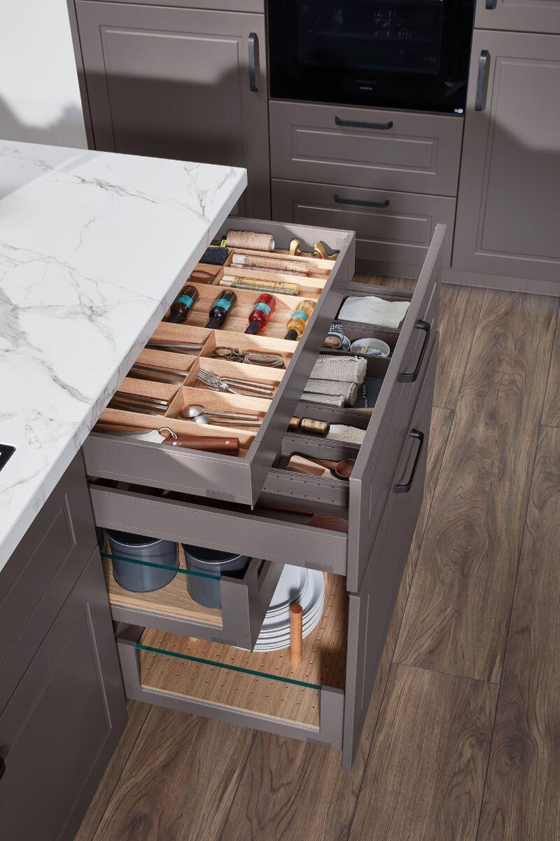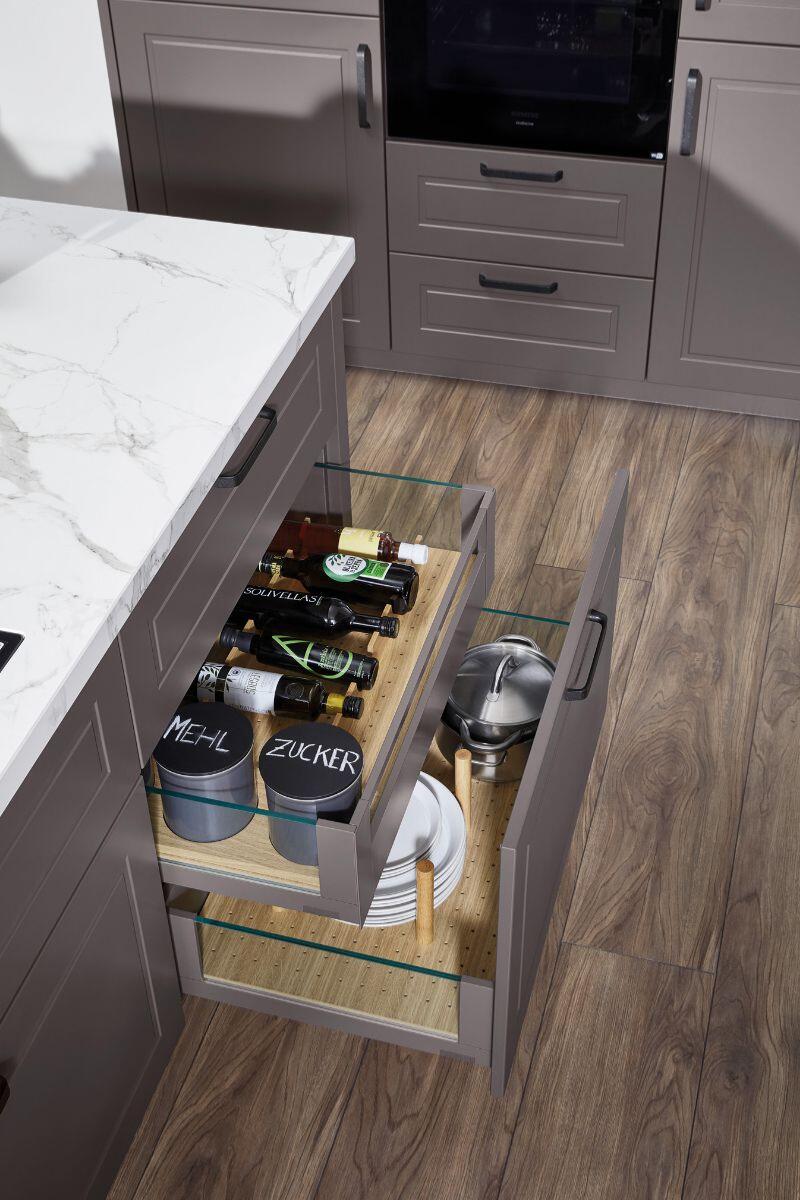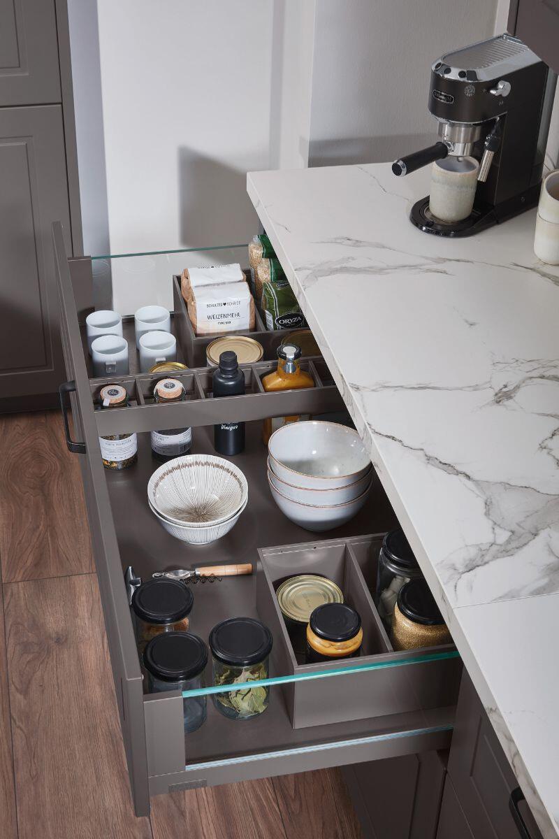 Με έμπνευση από τη φιλοσοφία NewTradition, η σύνθεση ισορροπεί ανάμεσα στην κλασική φινέτσα και τη σύγχρονη λειτουργικότητα. Οι coffered προσόψεις και το ύφος PREMIUMLINE 26 αποπνέουν διαχρονικότητα, ενώ το bar cabinet και οι ευρύχωρες λύσεις οργάνωσης εκφράζουν την αρμονία και την πρακτικότητα των γερμανικών επίπλων κουζίνας.