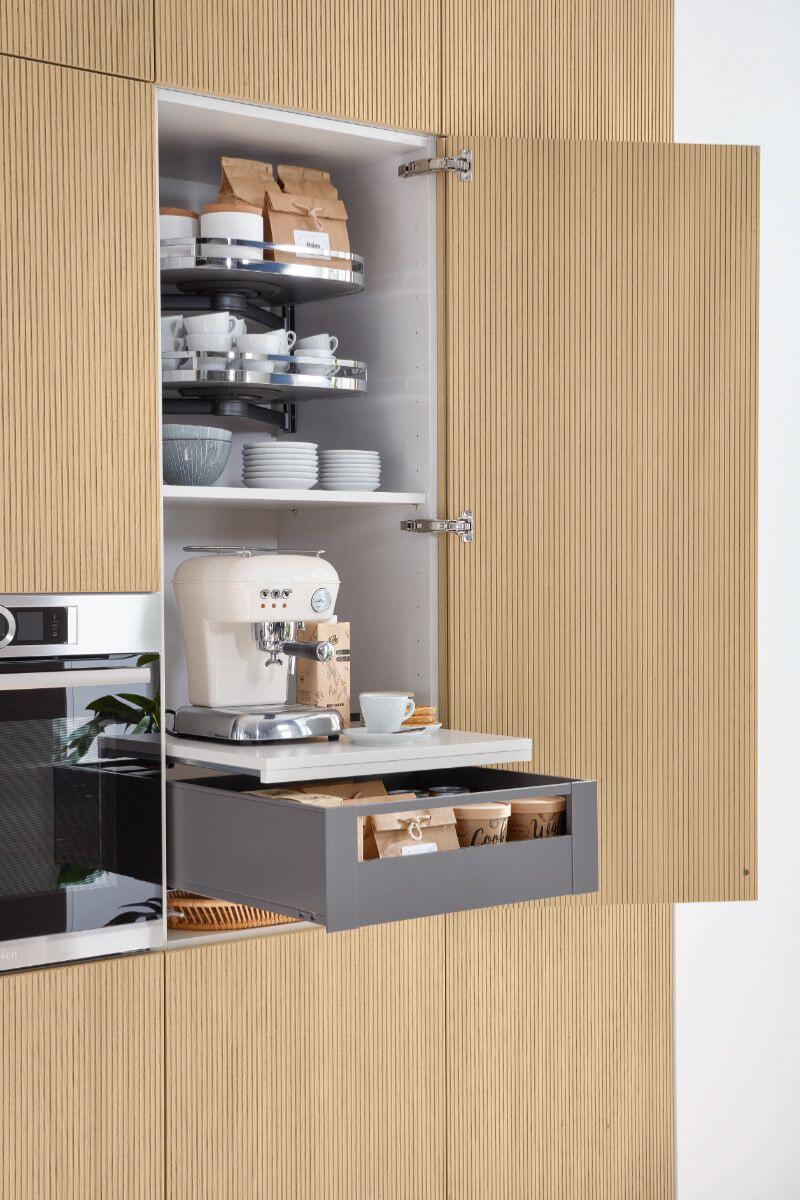 Η σύνθεση εκφράζει τη φυσική γοητεία του Gavi Oak μέσα από αυλακωτή επιφάνεια και λεπτομέρειες σε λάκα απόχρωσης agate white, αποτυπώνοντας τον χαρακτήρα των μοντέρνων επίπλων κουζίνας. Η ισορροπία υλικών και αποχρώσεων δημιουργεί έναν χώρο ζεστό και εκλεπτυσμένο, όπου η ποιότητα και η βιωσιμότητα της γερμανικής κατασκευής γίνονται καθημερινή εμπειρία.