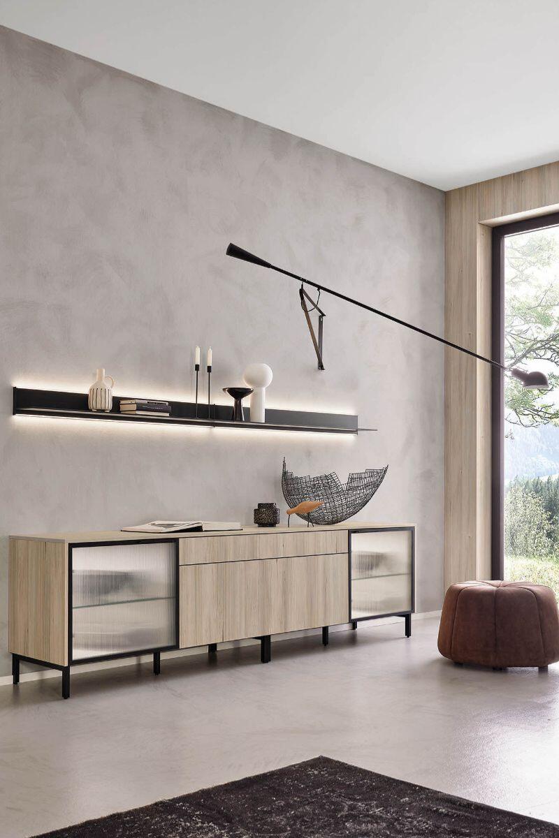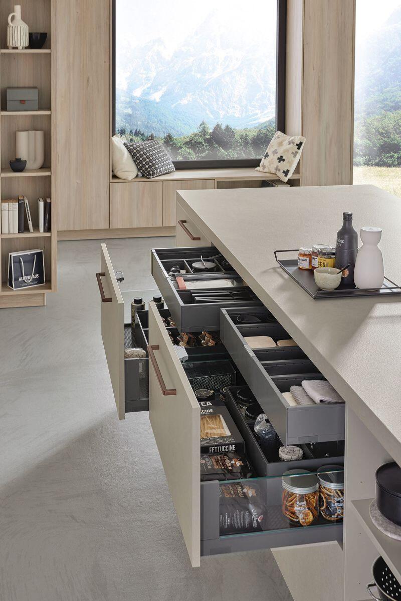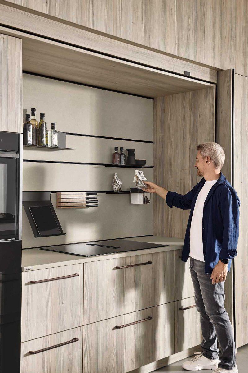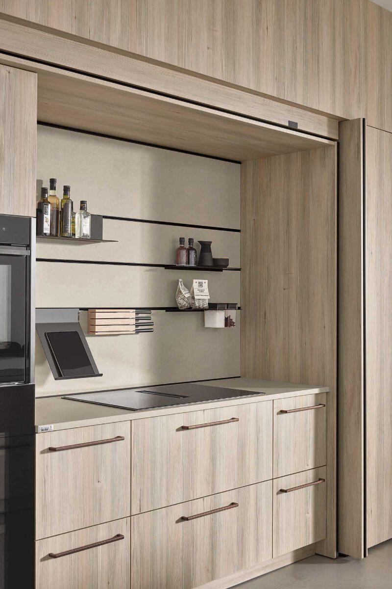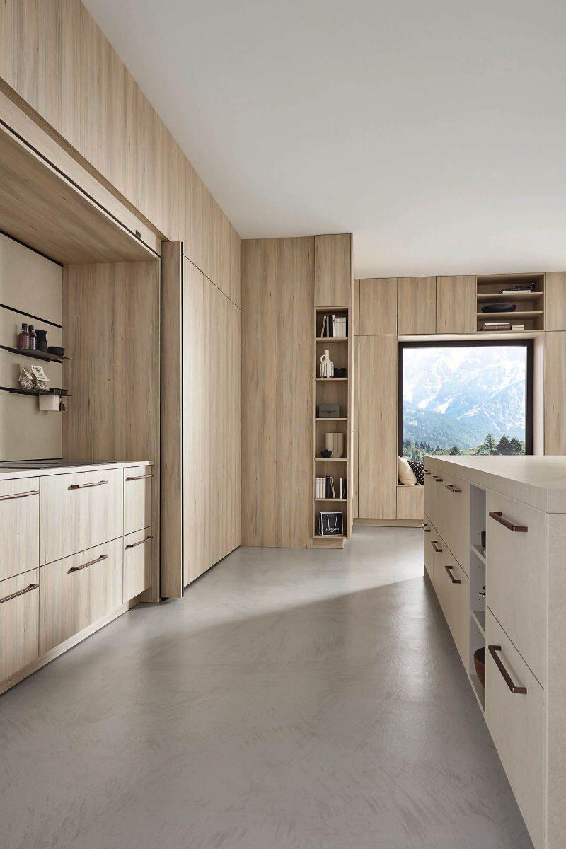 Εμπνευσμένη από το ελβετικό chalet style, η σύνθεση ενώνει τη ζεστασιά του φυσικού ξύλου με τη σύγχρονη κομψότητα του Natural Sandstone. Λειτουργικά στοιχεία όπως pocket doors, pull-out αποθηκευτικά και γραφείο fold-out εκφράζουν την ευελιξία και την πρακτικότητα που χαρακτηρίζουν τα γερμανικά έπιπλα κουζίνας.