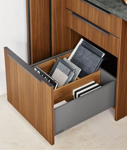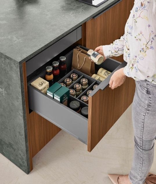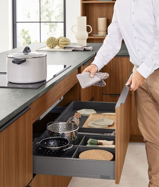 Τα συρτάρια της νησίδας, με διαφορετικά εσωτερικά στοιχεία εξοπλισμού, προσφέρουν άνετο χώρο για μπαχαρικά, μαχαιροπίρουνα, σκεύη, κατσαρόλες και μπολ, καλύπτοντας τις καθημερινές ανάγκες με οργανωμένο τρόπο.
