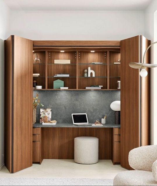 Οι pocket doors αποκαλύπτουν έναν άνετο χώρο εργασίας, κατάλληλο για διάβασμα ή home office, ενσωματωμένο αρμονικά στη σύνθεση.