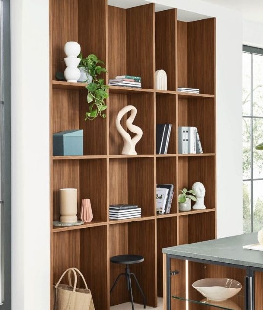 Η αίσθηση ζεστασιάς ενισχύεται από την όψη καρυδιάς, η οποία προσδίδει κομψότητα και οπτική ενότητα στον χώρο.