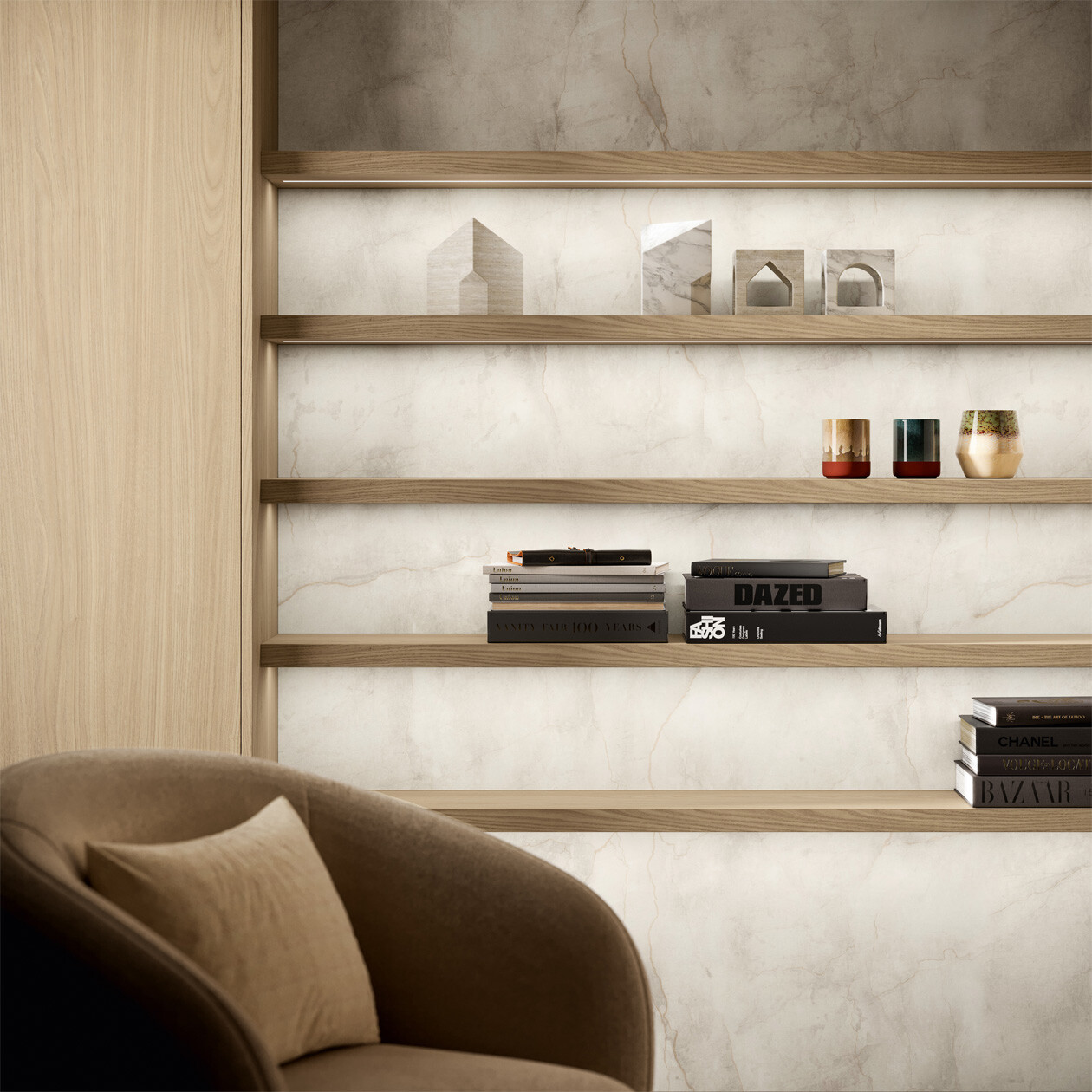 Οι πόρτες με πλαίσιο από μασίφ ξύλο και ανάγλυφες γραμμές προσδίδουν βάθος και χαρακτήρα. Τα διακριτικά γυάλινα στοιχεία επιτρέπουν στο φως να διαχέεται φυσικά, ενισχύοντας τη φωτεινότητα του χώρου.