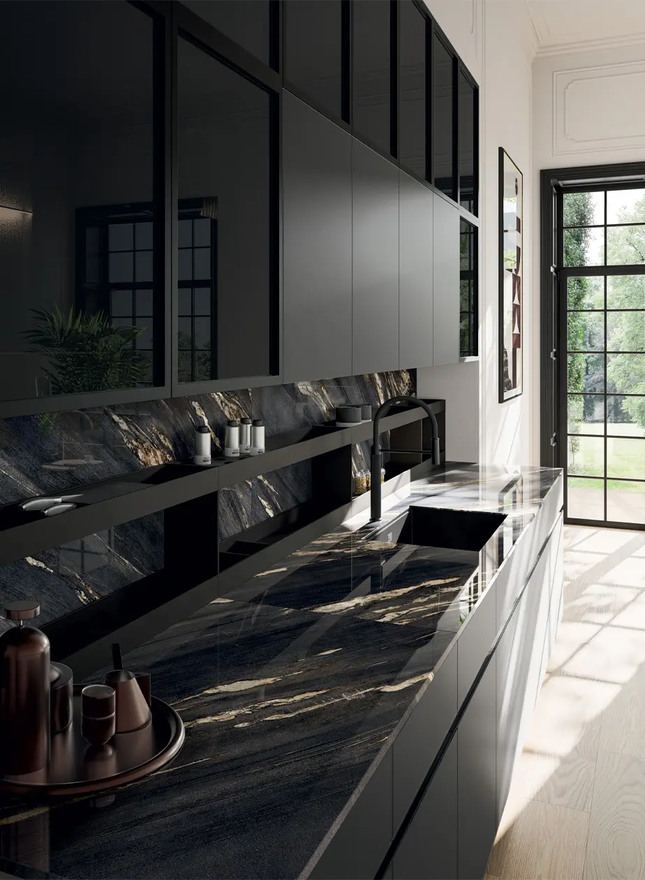 Η Glass 2.0 χαρακτηρίζεται από τη χρήση γυάλινων επιφανειών, που αποδίδουν διαφάνεια, φωτεινότητα και μια αίσθηση πολυτέλειας. Οι λεπτομέρειες στις λαβές και τα προφίλ προσφέρουν λειτουργικότητα χωρίς να διακόπτουν τη γεωμετρία της σύνθεσης. Η ισορροπία ανάμεσα στο ματ και το γυαλιστερό φινίρισμα προσδίδει βάθος και ηρεμία, ενώ η απουσία εξωτερικών λαβών διατηρεί μια ενιαία, κομψή όψη με μινιμαλιστικό χαρακτήρα.