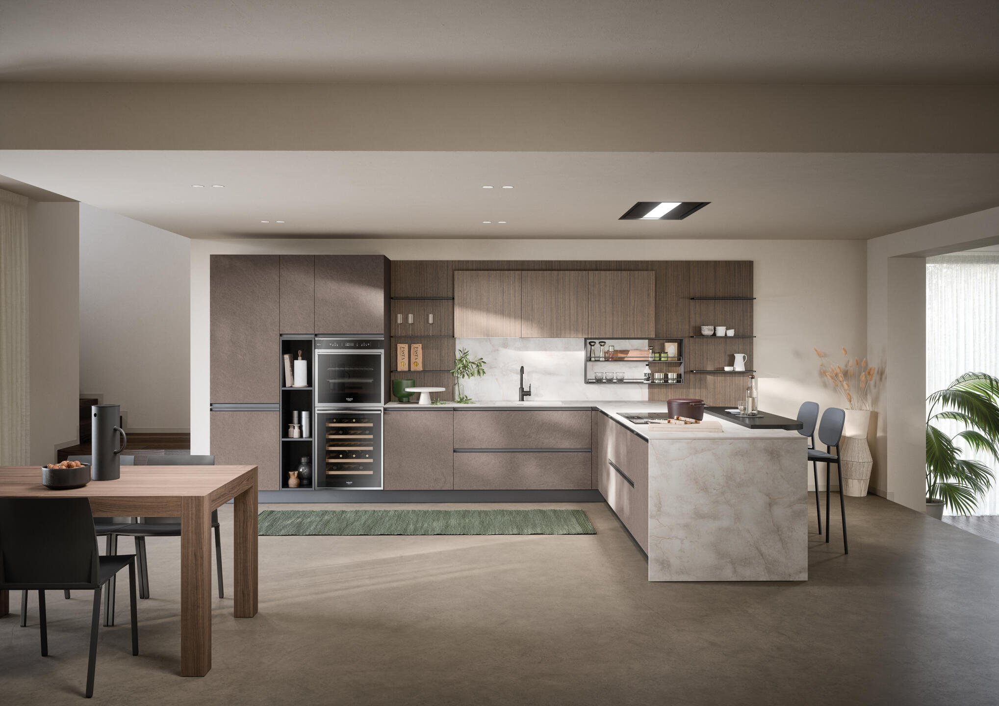 Η κουζίνα ενισχύεται από λειτουργικά ανοιχτά στοιχεία, όπως οι boiserie Ritmo, τα schienali Unit και το κάθετο στοιχείο αποθήκευσης, προσφέροντας επιπλέον χώρους χωρίς να βαραίνουν την εικόνα.
