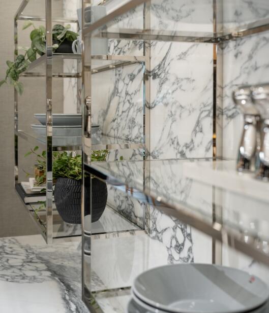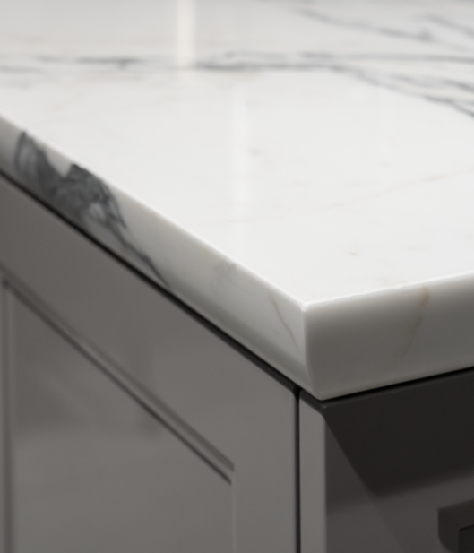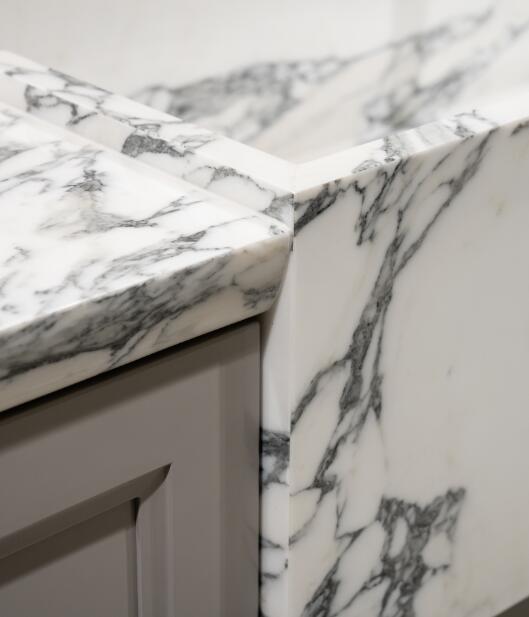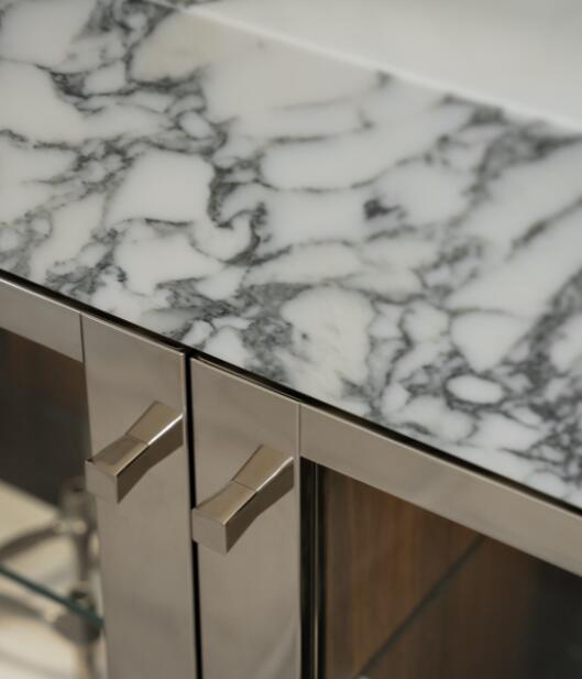 Οι μεταλλικές λαβές προσθέτουν ακρίβεια στη φόρμα, ενώ οι καμπύλες γωνίες του μαρμάρου χαρίζουν ομαλή συνέχεια και αισθητική ροή στο σύνολο.