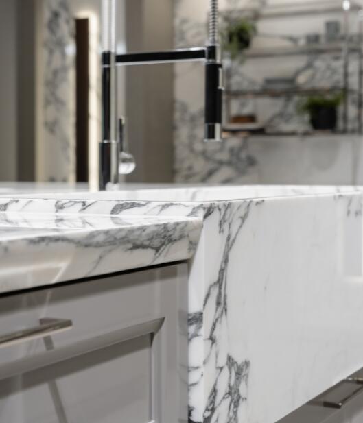 Ο νεροχύτης, σμιλεμένος από το ίδιο μάρμαρο που επενδύει την επιφάνεια, συνεχίζει αβίαστα τη σχεδιαστική γραμμή, χωρίς ορατές ενώσεις.